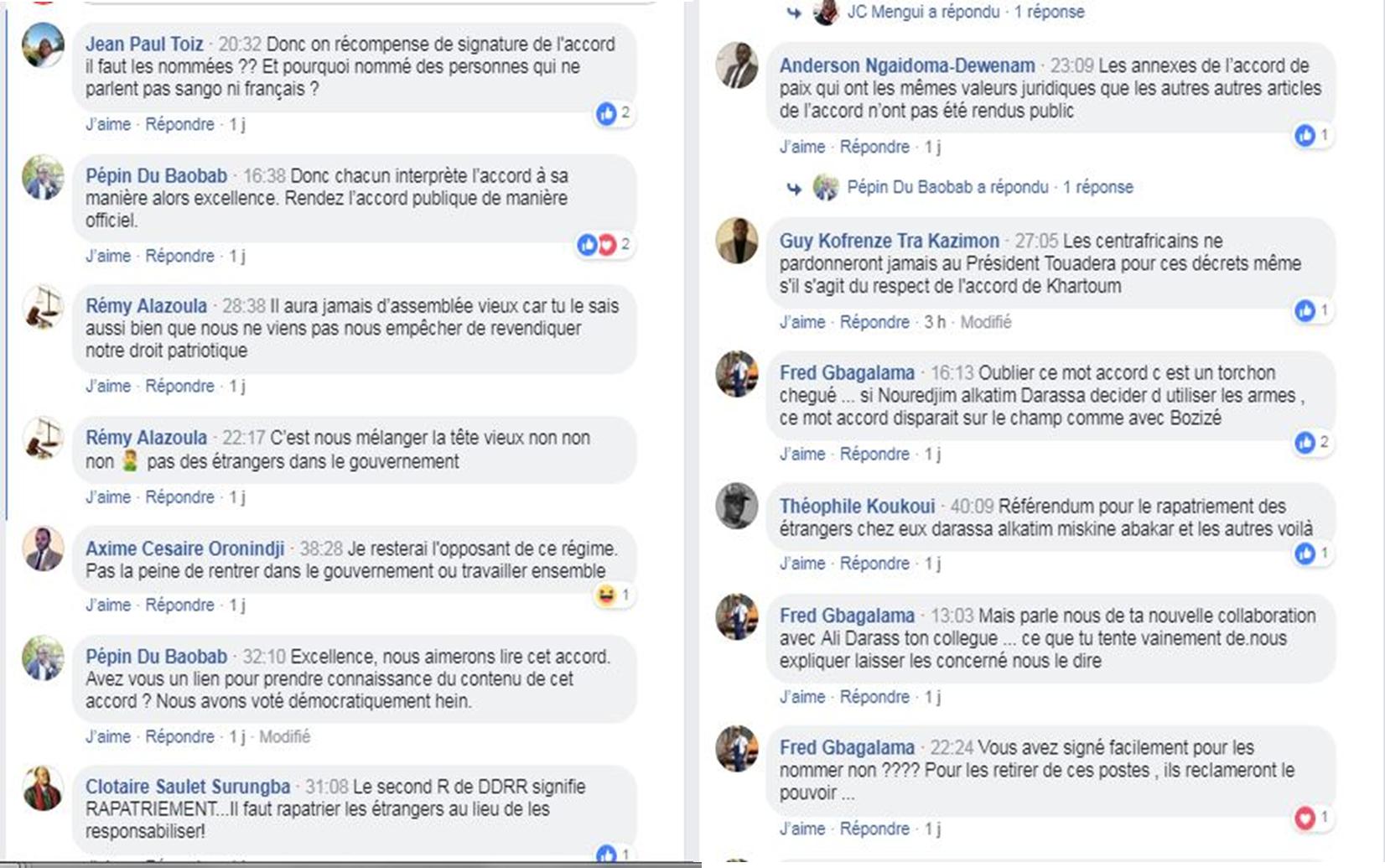 Suite à des commentaires pointus et pertinents, notre ministre conseiller spécial à la présidence essaie de rassurer « Vous qui criez sur les réseaux sociaux, j’ai votre dossier, je vous connais de A à Z. Calmez vous, le décret n’est pas encore fini. Ce décret, c’est juste pour les conseillers militaires, c’est au respect des textes d’accords de Khartoum…Maintenant vous les jeunes que je vous ai donné mon mail et vous m’avez envoyé vos CV, ne vous inquiétez pas, c’est entre la main du président ».