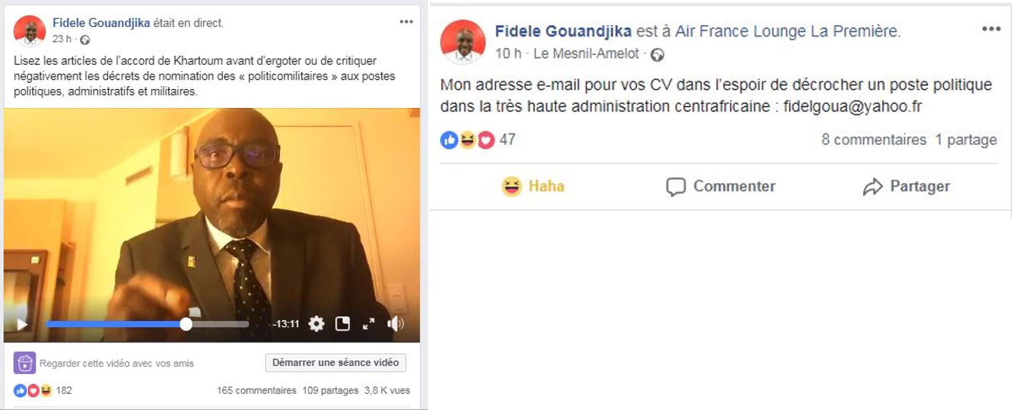 On peut lire ceci sur la page facebook de Fidèle Gouandjika : « Mon adresse e-mail pour vos CV dans l’espoir de décrocher un poste politique dans la très haute administration centrafricaine : fidelgoua@yahoo.fr »