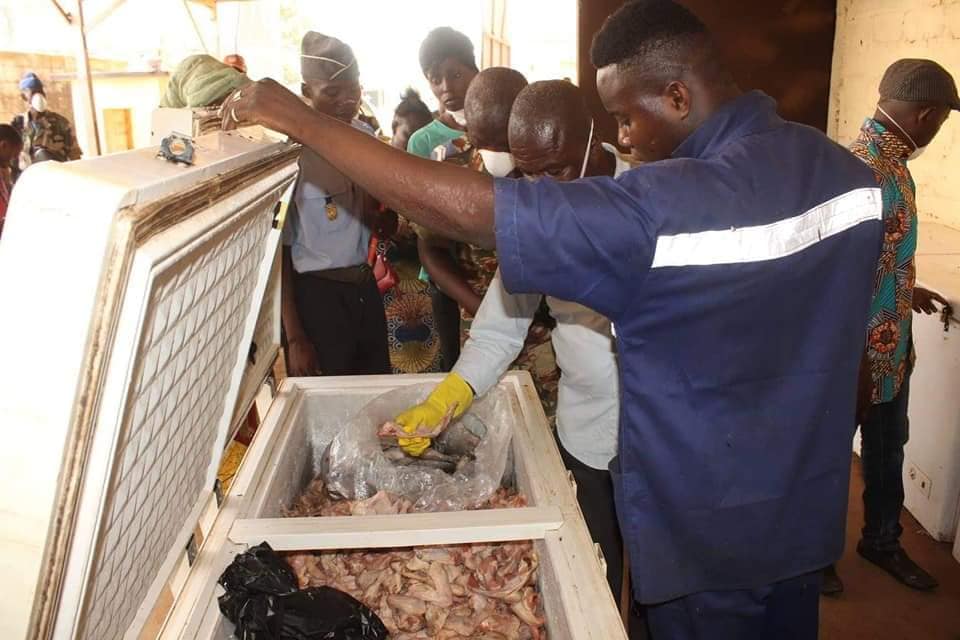 « La société FOBERB Centrafrique exerce dans la commercialisation des produits alimentaires, exportés généralement de Cameroun. Cette société commerciale possède plus de 9 chambres froides parmi lesquelles 2 contiennent des aliments bien conservés, alors que les sept autres contiennent des produits avariés tels que le poisson et le poulet en état de pétrification », à déclaré le Chef de Service d’hygiène de la Mairie de Bangui, Ferdinand KANDA qui a constaté les faits surplace, avant d’ajouter que « l’État des aliments que cette société vend à la population est déplorable et les conditions d’hygiène ne sont pas respectées avec la pollution sur les lieux et la présence des asticots partout dans les chambres froides ainsi que sur le sol ». Les produits ne sont pas bien conservés, a-t-il poursuivit avec plus de 42 cartons de poulets pourris, 31 cartons des poissons Maquereau et Chinchard ainsi que des boites de conserves des jus et les boissons en canette dont la date de péremption est dépassée.