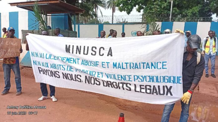Bangui 19 juin 2025—(Ndjoni Sango): Dans la matinée du jeudi, le quartier général de la MINUSCA à Bangui a été le théâtre d’un mouvement de protestation pacifique mais déterminé. Des dizaines de travailleurs journaliers de la mission onusienne ont exprimé leur colère face à des années d’exploitation et à des licenciements brutaux.