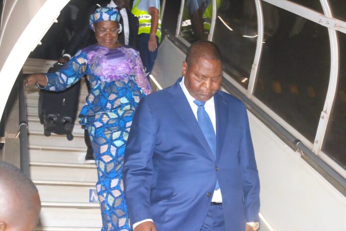 À sa descente d’avion à l’aéroport international Bangui M’Poko, le Chef de l’État a été accueilli par le Premier Ministre Félix Moloua, l’ensemble des membres du Gouvernement, ainsi que les membres de son Cabinet, venus saluer le retour du Président au pays.