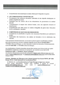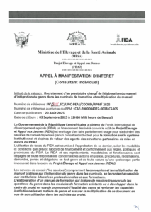 Bangui 20 Août 2025–(Ndjoni Sango): L’Unité nationale de Coordination du Projet Elevage et Appui aux Jeunes (PEAJ), placée au Ministère de l’Elevage et de la Santé Animale, lance, sur financement de FIDA, un appel à manifestation l’intérêt pour le recrutement d’un prestataire chargé de l’élaboration du manuel d’intégration du genre dans les curricula de formation et multiplication du manuel.