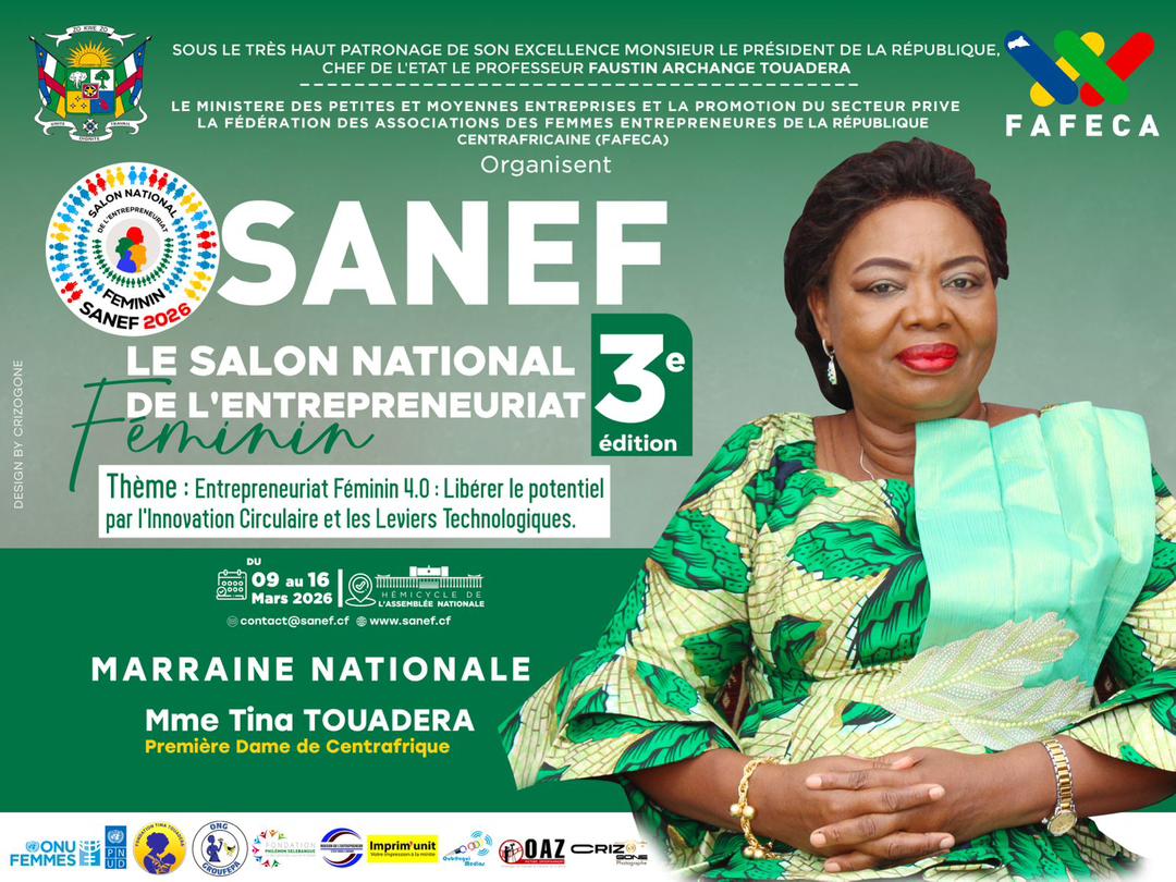 Bangui 16 fevrier 2026—(Ndjoni Sango) : Placée sous le marrainage de Tina Marguerite Touadera, Première Dame de la République centrafricaine, l’édition 2026 du SANEF s’inscrit dans une dynamique de promotion de l’entrepreneuriat féminin et de valorisation du potentiel économique des femmes.