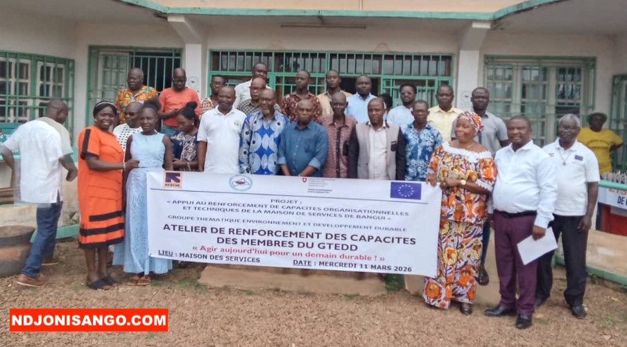 Bangui 12 mars 2026—(Ndjoni Sango) : À Bangui, la Maison de services située dans le 2ᵉ arrondissement a accueilli, le 11 mars 2026, un atelier de renforcement des capacités des membres du Groupe Thématique sur les Enjeux de l’Environnement et du Développement Durable (GTEDD).