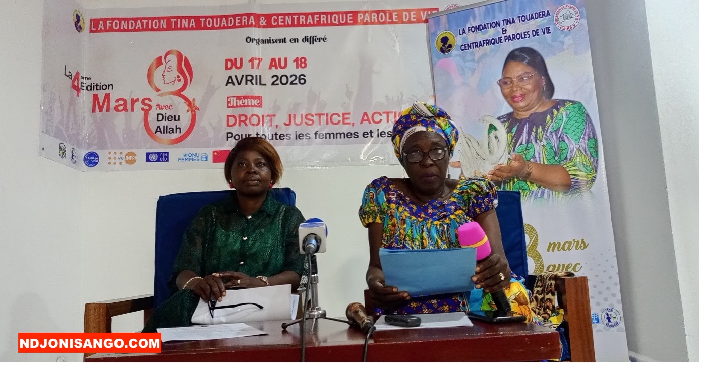 Bangui 17 avril 2026—(Ndjoni Sango): Dans l’objectif de replacer la femme centrafricaine au cœur de ses droits et dignité, mais aussi de son héritage spirituel, la fondation tina Marguerite Touadera et Centrafrique parole de vie, lancent en différé, la 4ème édition du moment de prière, 8 mars avec Dieu/ Allah, du 17 au 18 avril au Palais de l’omnisports. L’annonce est faite dans un point de presse tenu le jeudi 16 avril à Bangui par le comité d’organisation.