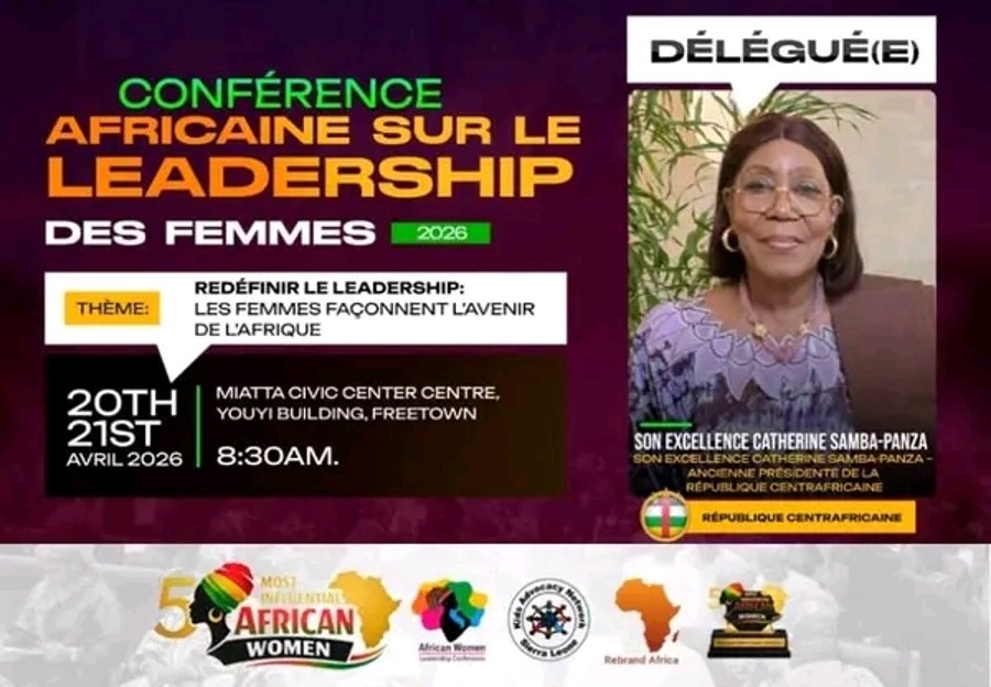 Bangui, 17 avril 2026 — (Ndjoni Sango): La République centrafricaine sera représentée à la Conférence africaine sur le leadership féminin, prévue du 20 au 21 avril 2026 à Freetown, en Sierra Leone. À cette occasion, Catherine Samba-Panza, ancienne cheffe de l’État de transition, et son assistante personnelle, Berth-Rosalie Kobo, porteront la voix des femmes centrafricaines sur cette tribune continentale.
